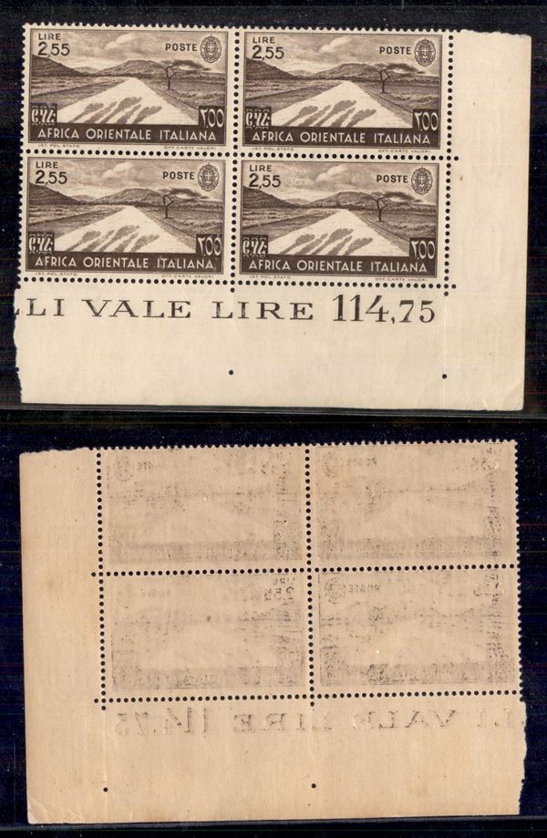 1938 - 2,55 lire Soggetti vari (16) - quartina angolo di foglio - gomma originale nella coppia superiore e integra in quella inferiore