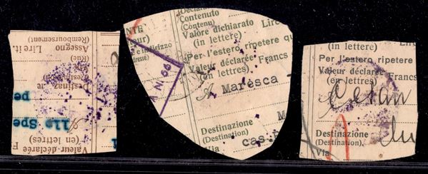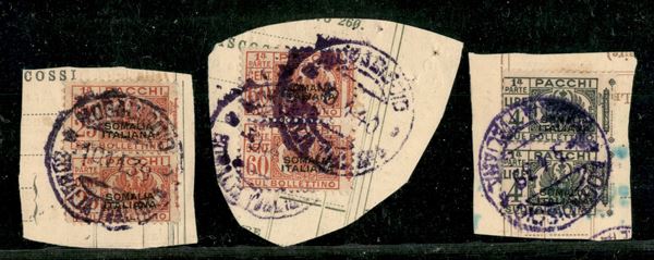 1939/1940 - Insieme di 3 coppie verticali 25 cent + 60 cent + 4 lire Pacchi Postali (56+59+63) - Parti sinistre usate su 3 frammenti a Mogadiscio