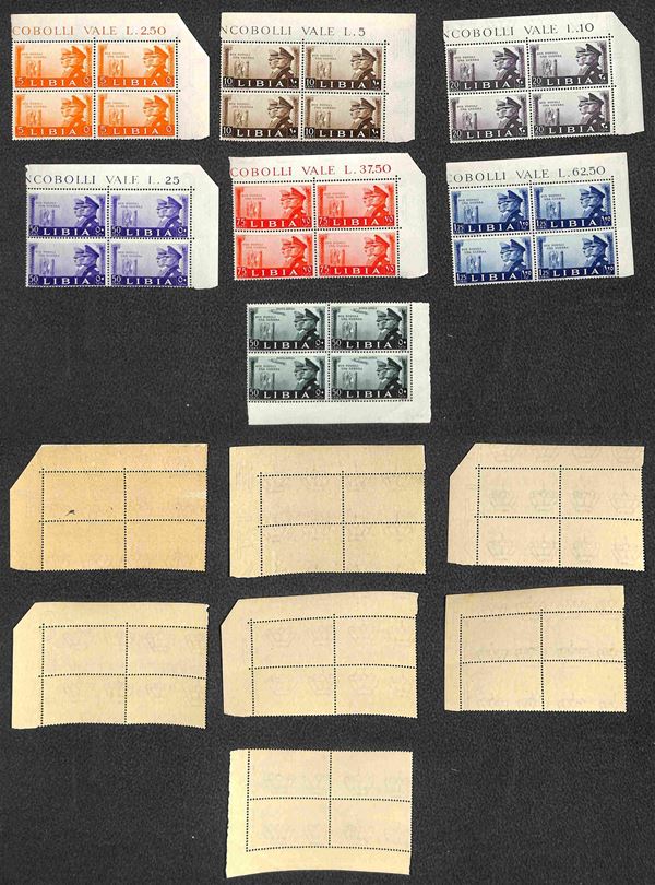 1941 - Fratellanza Italo Tedesca (171/173 + 175/177 + Aerea 45) -7 valori in quartine - gomma integra - due 5 cent (171) con aderenze di carta (500+)