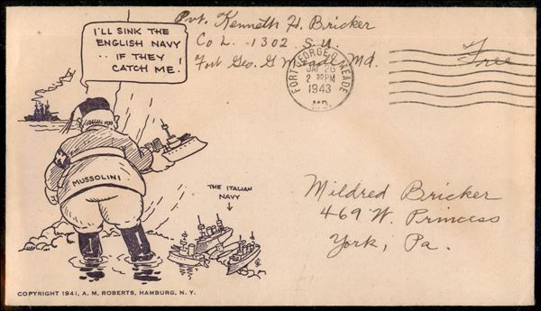 1943 - Propaganda Bellica - Busta illustrata (satirica - Mussolini nasconde le navi) usata