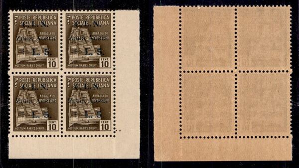 1944 - 10 cent + 5 lire (5) - quartina angolare con soprastampa ripetuta a secco sul margine destro - gomma integra (630++)