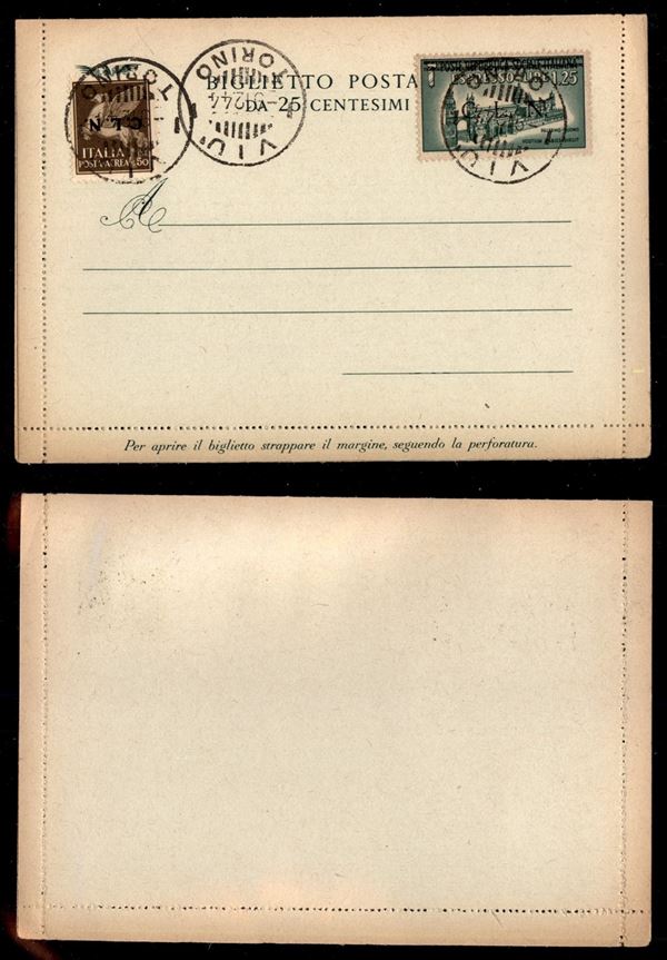1944 - 50 cent (CEI 15 varietà) con soprastampa capovolta + 1,25 lire (CEI 17) a ricoprire - usati su biglietto postale RSI - Viù 9.12.44