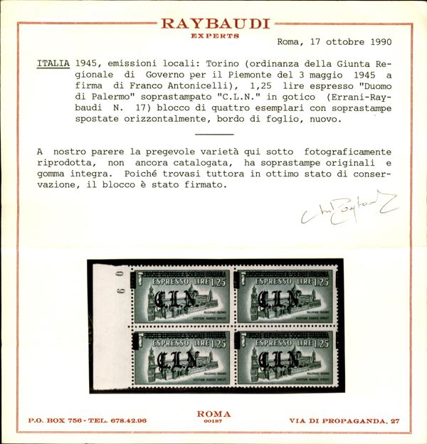 1945 - 1.25 lire Espresso (Errani 17 varietà) in quartina bordo foglio - soprastampe spostate a sinistra (a cavallo del margine) - gomma integra - non catalogato - cert. Raybaudi
