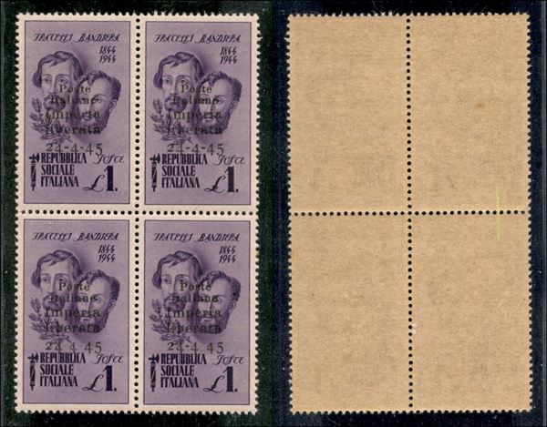 1945 - 1 lira Bandiera (14) in quartina - senza trattini (14d) + senza trattino tra 4 e 45 (14c) nella coppia inferiore - gomma integra (330+)