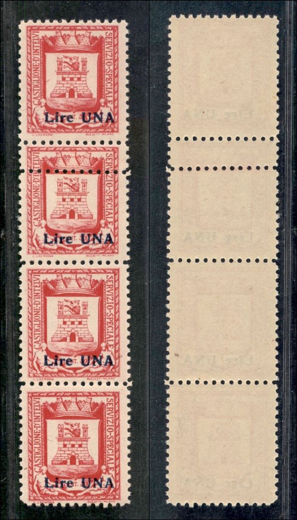 1945 - 1 lira su 50 cent (19cb) con doppia dentellatura in striscia con 3 normali - gomma integra (330+)