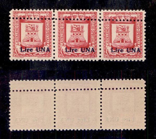 1945 - 1 lira su 50 cent (19ce) - striscia orizzontale di tre - con doppia dentellatura (obliqua) in alto - gomma integra (990)