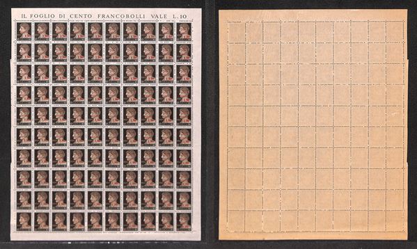 1945 - 10 cent + 1,90 lire (1) - intero foglio di 100 con tutti gli errori e le varietà della composizione - gomma integra