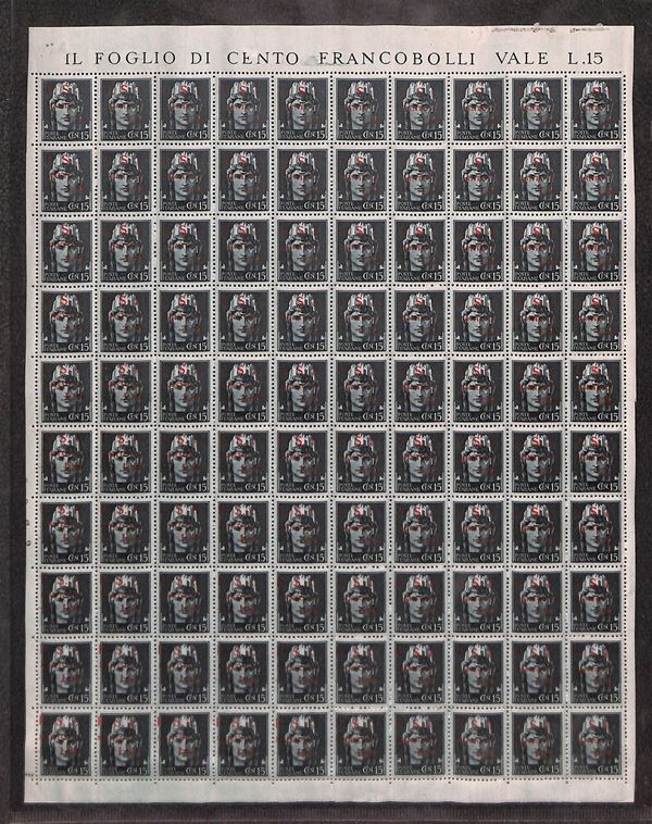 1945 - 15 cent + 1,85 lire (2) - intero foglio di 100 con soprastampe oblique (non catalogato) - parte inferiore sinistra del foglio con soprastampe spostate in alto a sinistra - sono presenti tutti gli errori e le varietà di composizione compresa la r (senza punto dopo P e S) - gomma integra - raro insieme