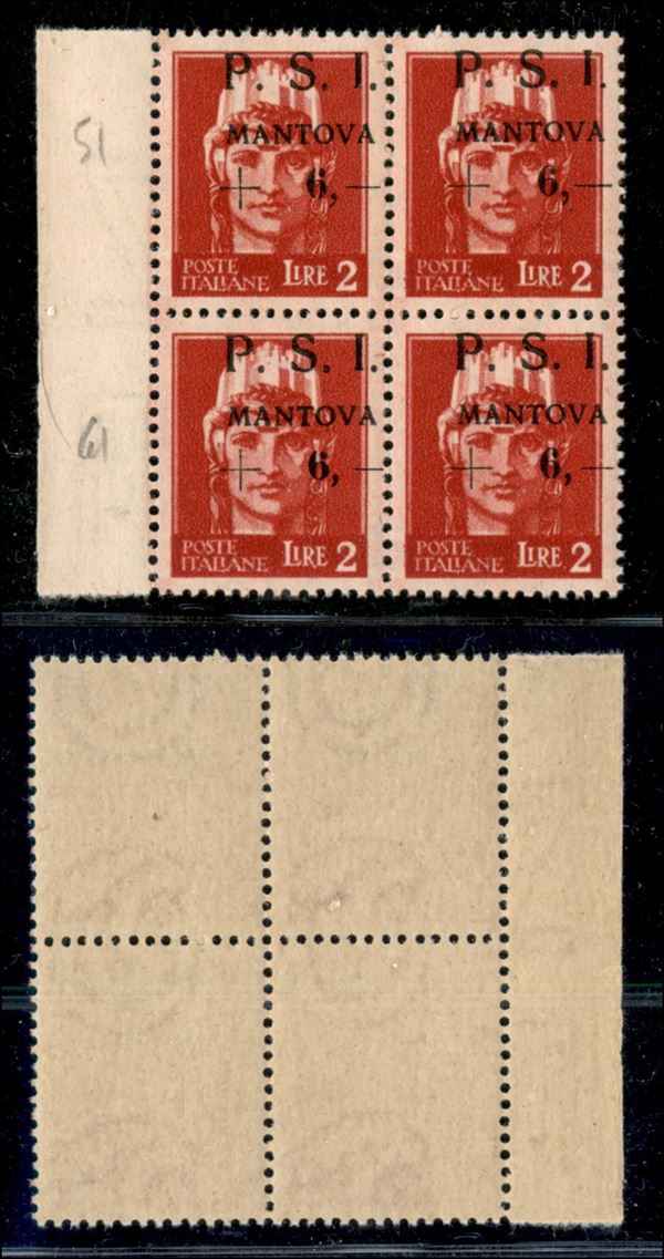 1945 - 2 lire + 6 (8ea) - quartina con soprastampe spostate in alto a destra - nuovo con gomma originale integra (1.600+)