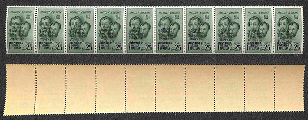 1945 - 25 cent Bandiera (13) - striscia orizzontale di 10 - notati gli errori 13b (due) + 13c - gomma integra (550+)