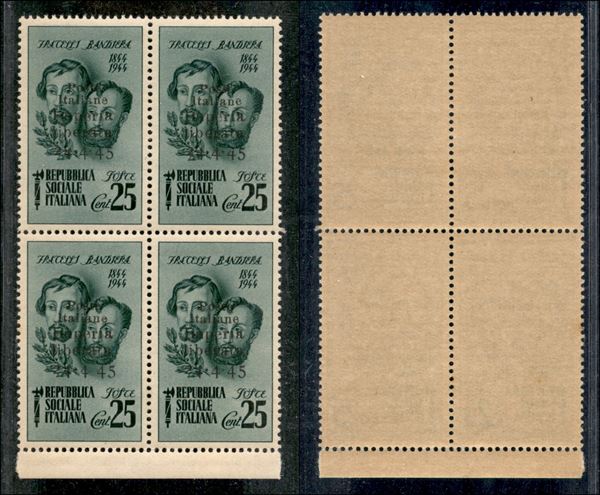 1945 - 25 cent Bandiera (13) in quartina - senza trattino tra 4 e 45 (13c) in basso a sinistra - gomma integra (195+)