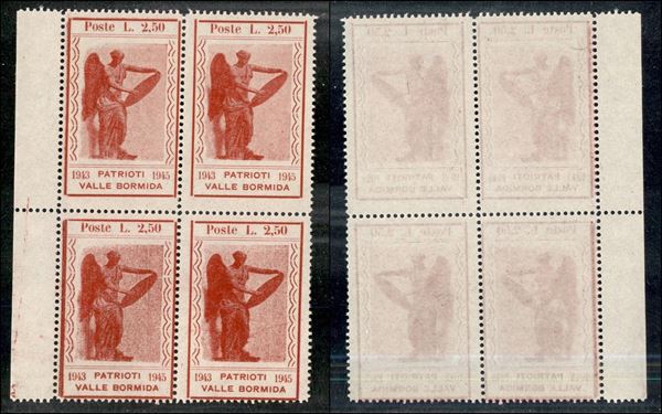 1945 - 2,50 lire Vittoria (15) in quartina (di formati diversi) - sempre senza gomma - doppio filo di riquadro in basso a sinistra - non catalogato (120+)