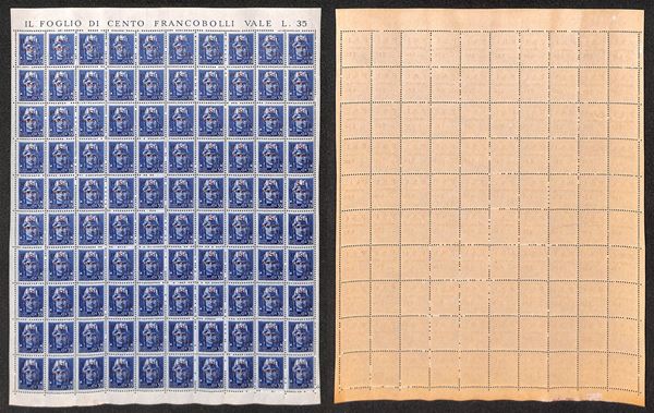 1945 - 35 cent + 2,15 lire (3) - intero foglio di 100 con tutti gli errori di composizione - gomma integra - notato P con invisibile traccia di punto + S senza punto (pos. 83) - non comune