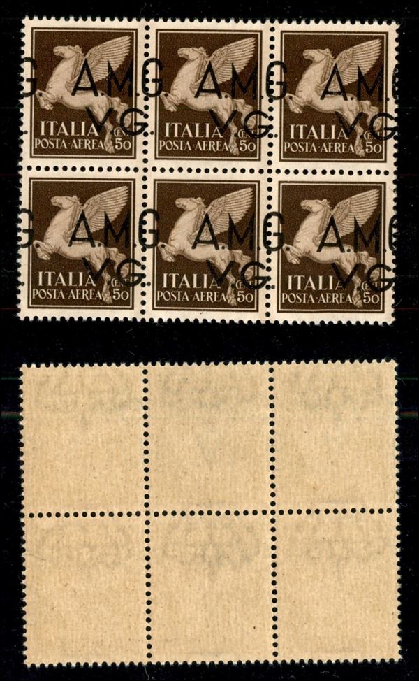 1945 - 50 cent (1ga) - blocco di 6 con G a cavallo - gomma integra (480++)