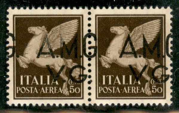 1945 - 50 cent Aerea (1 ga) - coppia orizzontale con soprastampa spostata (g a cavallo) - gomma integra