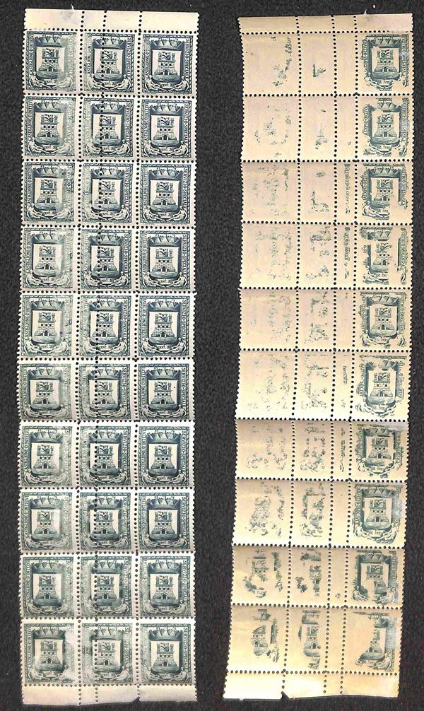 1945 - 50 cent Stemma (14e + 14) - blocco verticale di 30 con doppia dentellatura verticale (obliqua) al centro - gomma integra - residui di stampa al retro (825+)