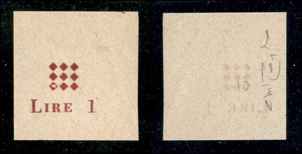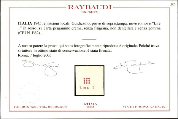 1945 - Non emesso - Prove di macchina della soprastampa (1B) - bordo di foglio - sempre senza gomma - Cert. Raybaudi
