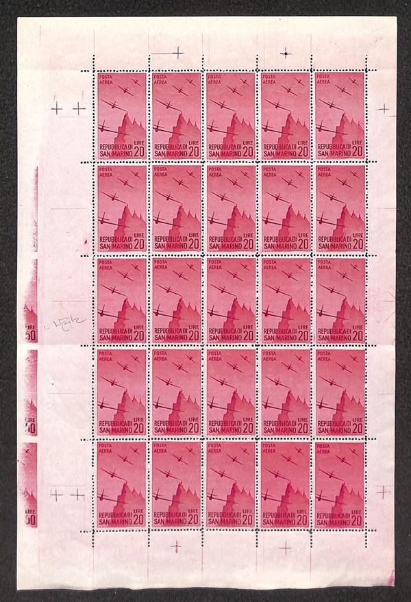 1946 - 20 lire Vedute (57 + 57ab) - foglio di 25 - bordo da interspazio a sinistra (non tosato) con stampa parziale del 50 lire - gomma integra - cert. Raybaudi