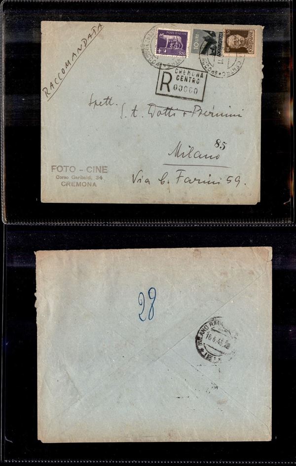 1946 (14 giugno) - raccomandata da Cremona a Milano con affrancatura mista Regno + Luogotenenza + Democratica (256 + 516 + 558)