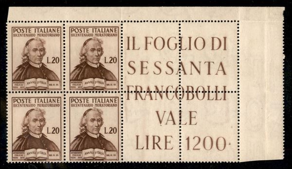 1950 - 20 lire Muratori (625) - blocco angolare con scritte a margine - gomma integra con bande brune da classificatore