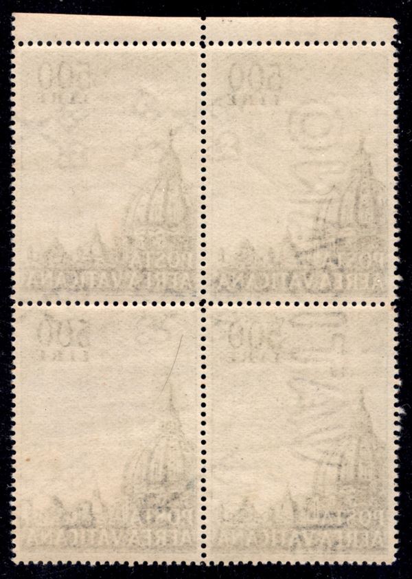 1958 - 500 lire Cupola Posta Aerea (33) - quartina - coppia verticale sinistra con filigrana VATICANO - gomma integra