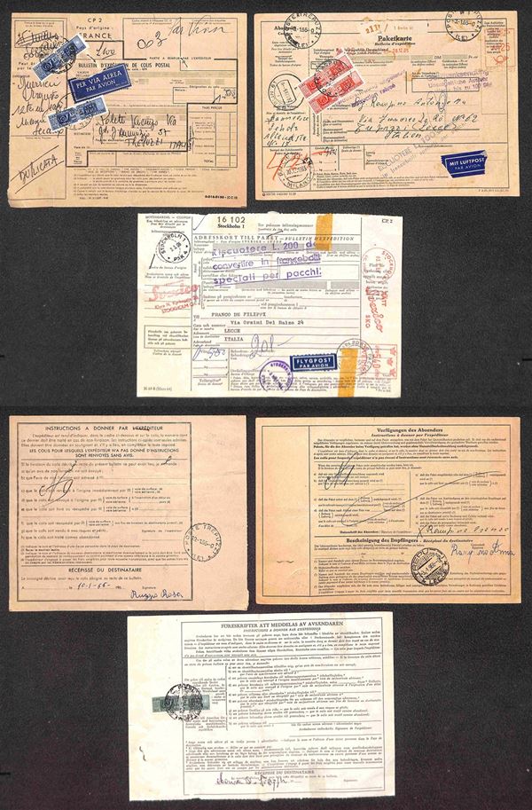 1965/1966 - Tre Bollettini Pacchi per Via Aerea da Parigi Berlino e Stoccolma con valori del periodo