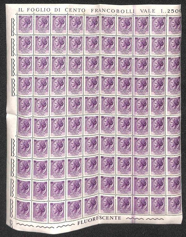 1968 - 25 lire Turrita (1073) - intero foglio di cento con taglio chirurgico verticale - gomma integra