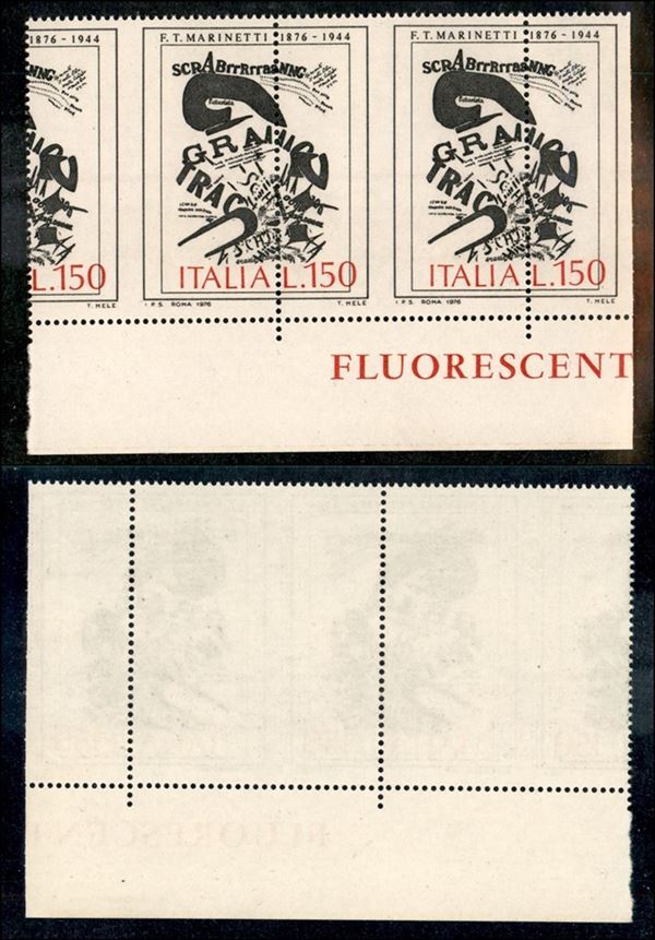 1976 - 150 lire Marinetti (1338) - coppia bordo foglio con dentellatura verticale e rosso spostati (valore a sinistra) - gomma integra