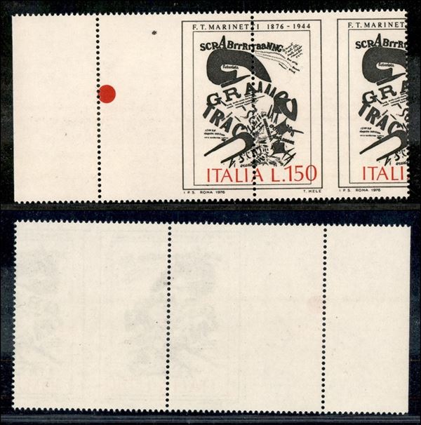 1976 - 150 lire Marinetti (1338) - coppia bordo foglio con dentellatura verticale al centro e sul bordo + rosso spostato - gomma integra