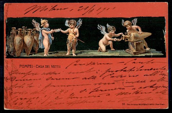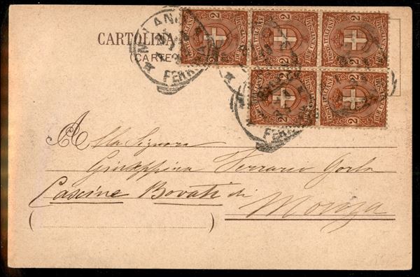 2 cent Stemma (66) - blocco di cinque su cartolina da Milano a Monza del 31.1.01