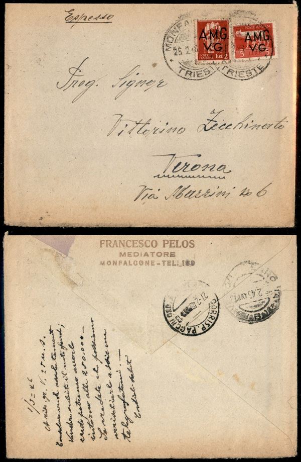 2 lire + 5 lire (9 + 10) - espresso da Trieste a Verona del 25.2.46