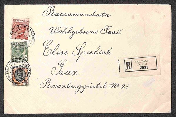 2 lire Floreale (150) + complementari (81+127) - raccomandata da Bolzano a Graz del 17.11.1925