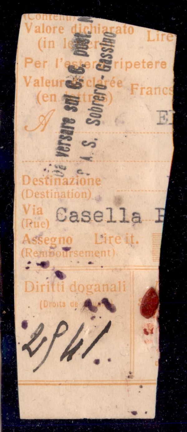 2 lire Pacchi Postali (36) - quattro metà sinistre usate su frammento di Bollettino a Mogadiscio