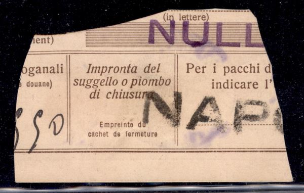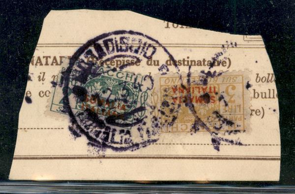 2 lire Pacchi Postali (36) + 3 lire Pacchi Postali (37) - due metà sinistre usate su frammento di Bollettino - Mogadiscio 12.3.1940