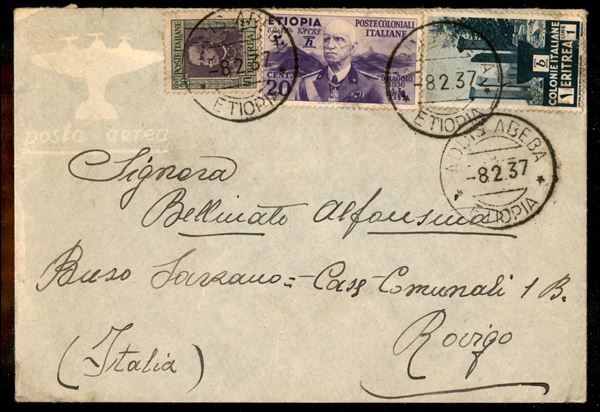 20 cent (2) + Eritrea (197 + 209) - aerogramma da Addis Abeba a Rovigo del 8.2.37