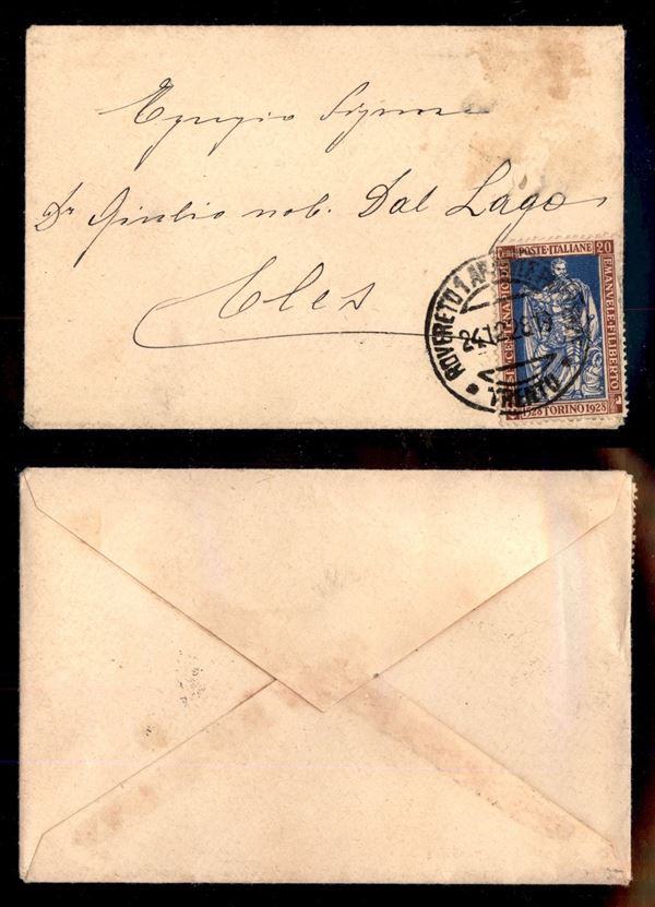 20 cent Filiberto (230) isolato su bustina da Rovereto a Cles del 24.12.28