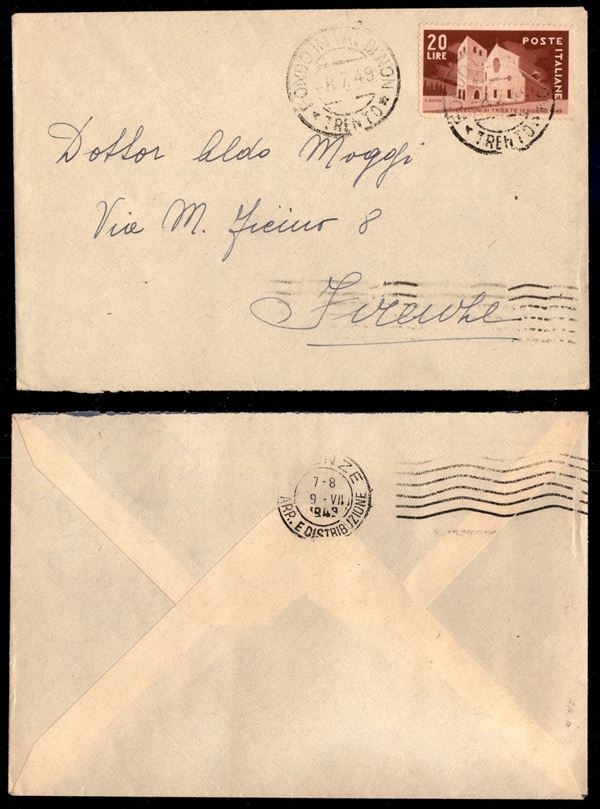 20 lire Trieste (606) isolato su busta da Fondo a Firenze del 8.7.49