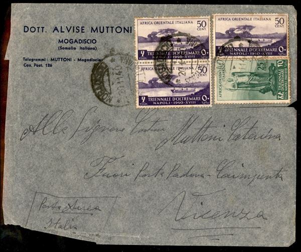 25 cent (29) + tre 50 cent (30) - aerogramma da Mogadiscio a Vicenza del 20.11.40