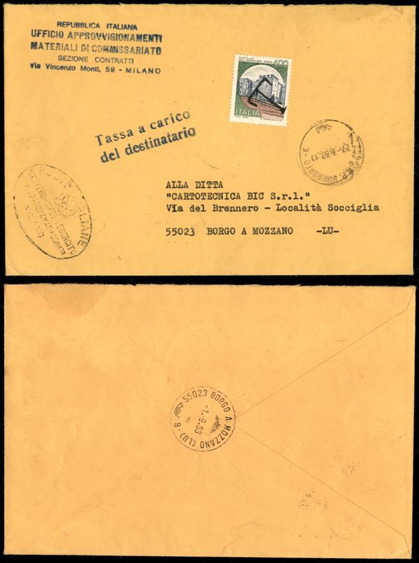 400 lire Castelli (1520) usato come tassa in arrivo su busta da Milano a Borgo a Mozzano del 27.8.83