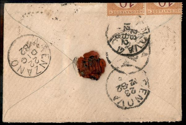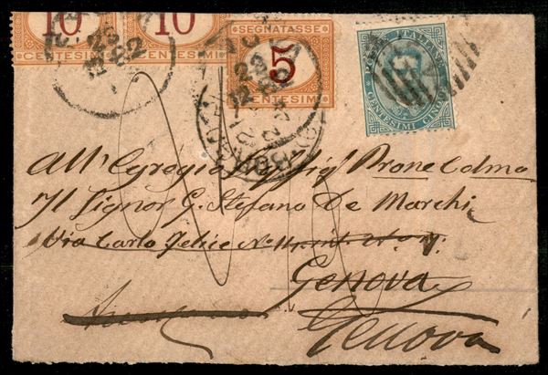 5 cent Umberto (37) isolato su bustina da Borgo Pila a Genova del 21.12.82 inoltrata a Arenzano e poi rispedita a Genova tassata (6 coppia applicata a cavallo + 5 - Segnatasse)