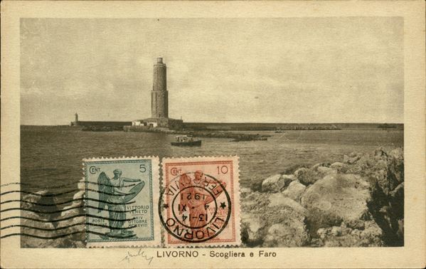 5 cent Vittoria (119) + 10 cent Vittoria (120a - dent. 13 1/2 x 13 3/4) su cartolina in tariffa da Livorno a Firenze del 4.11.21 - Cert. Chiavarello