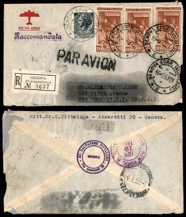 5 lire Siracusana (710) + tre 100 lire Lavoro (651) - aerogramma raccomandato da Genova a New York del 16.6.53