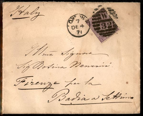 6 pence (30 - tav. 9) isolato su busta da Londra a Firenze del 4 dicembre 71