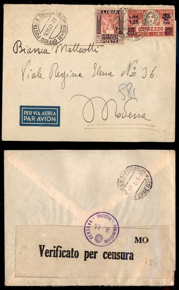 75 cent (104) + 1,25 lire su 60 cent (17 - Espressi) - aerogramma dall’Uff. Post. Concentramento per Modena del 14.11.41104+17 espressi