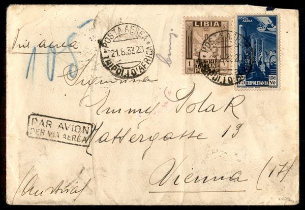 75 cent (11 - Aerea) + 1 lira Pittorica (65 Libia) - aereogramma da Tripoli a Vienna del 21.8.33