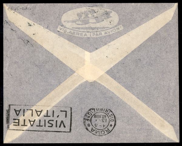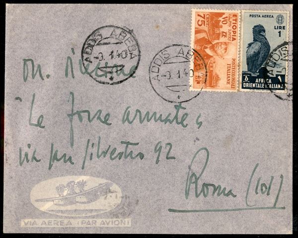 75 cent (6) + 1 lira Posta Aerea (A.O.I. 5) su lettera via aerea da Addis Abeba per Roma del 3.1.40