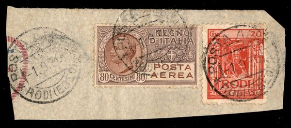 80 cent Posta Aerea (3A - Regno) in uso misto con 20 cent (5) su frammento di aerogramma da Rodi del 1.9.30