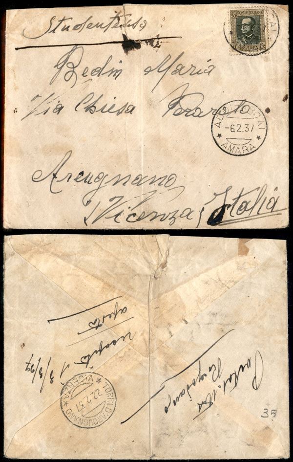 Addi Arcai Amara - 50 cent (199 - Eritrea) su busta per Vicenza del 6.2.37