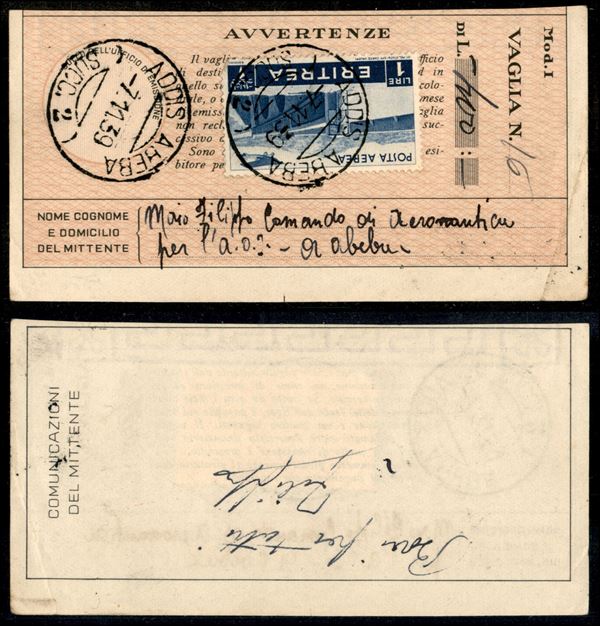 Addis Abeba (Succ. 2) - 1 lira (21 Aerea - Eritrea) su ricevuta vaglia del 7.11.39