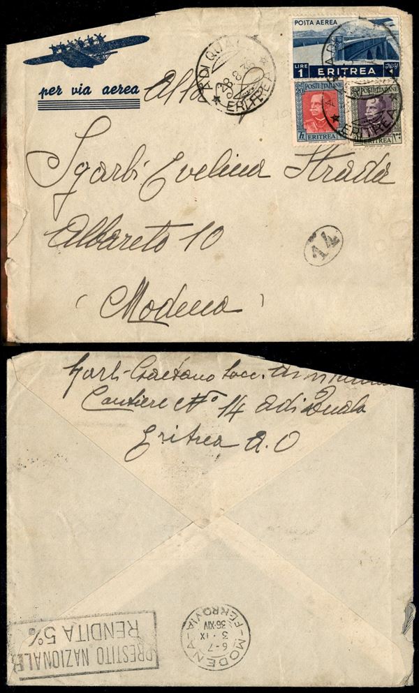 Adi Quala Eritrea - aerogramma per Modena del 28.8.36 (196 + 197 + Aerea 21)